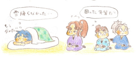 絵は雪を期待しすぎてへこみすぎる小平太と部下達です。