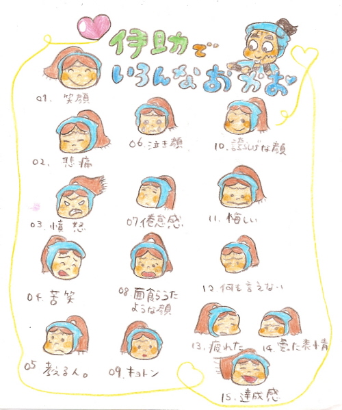 01. 笑顔 02. 悲痛 03. 憤怒 04. 苦笑 05. 考える人。 06. 泣き顔 07. 倦怠感 08. 面食らったような顔 09. キョトン 10. 誇らしげな顔 11. 悔しい 12. 何も言えない 13. 疲れた 14. 曇った表情 15. 達成感